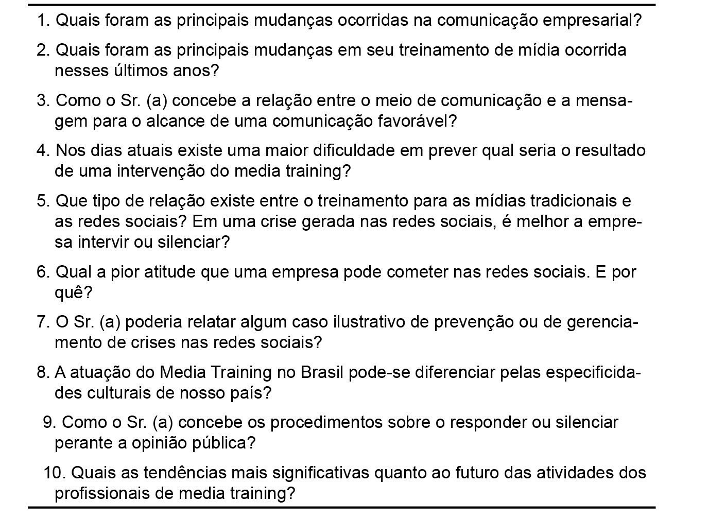 Nesse artigo será utilizada a denominação Media Training (MT) também para as atividades de Media Coaching, visto que, além de serem complementares, essa distinção, embora continuamente presente nas atividades dos profissionais, nas publicações acadêmicas quase sempre é omitida (Lucas, 2007; Barbeiro, 2008).