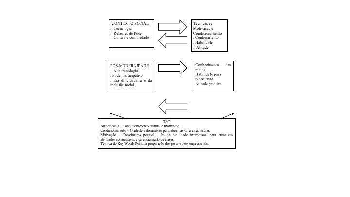 Como descrito no Quadro II “Características da TSC”, o comunicador empresarial atua de forma intencional para se antecipar às situações que potencialmente podem se transformar em oportunidade de mercado ou mesmo em uma possível crise por meio de contínuas ações e reflexões auto investigadoras de seu comportamento numa bidirecionalidade dinâmica com base na dialogicidade que se estabelece entre a empresa e o ambiente.