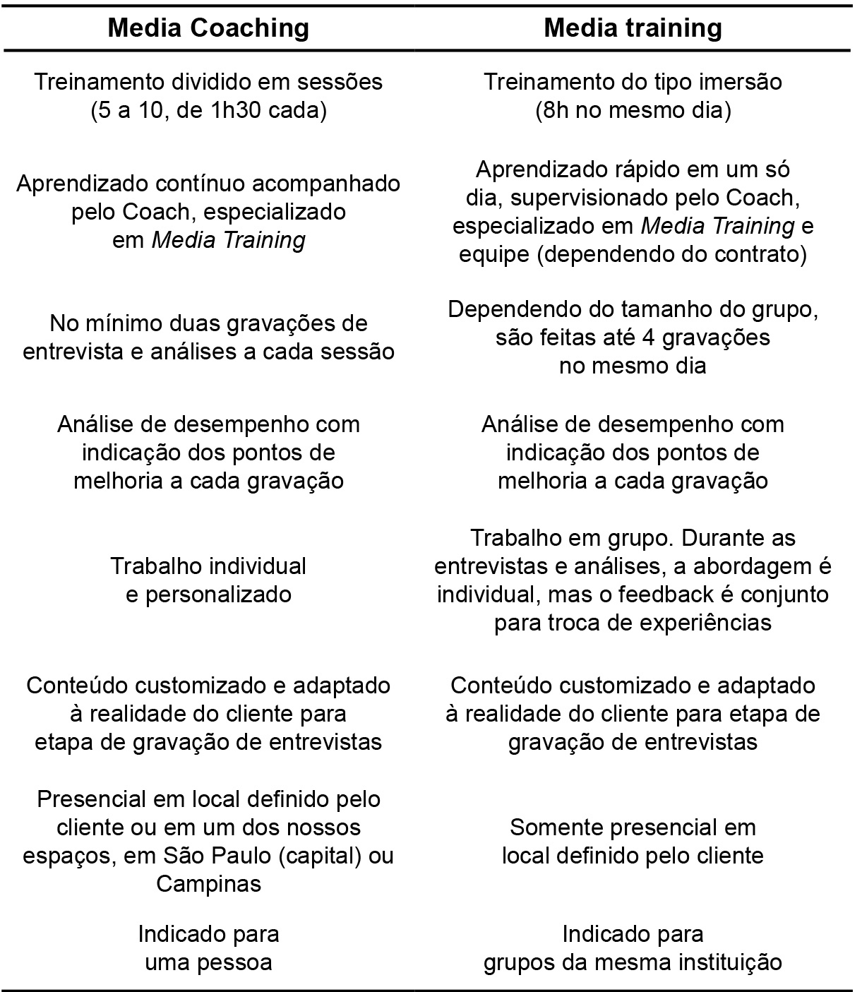 Com base no quadro anterior, pode-se conceber as atividades do Media Training voltadas para um grupo que procura objetivos em comum, enquanto o Media Coaching é mais especializado e direcionado a uma única pessoa, geralmente os porta-vozes.