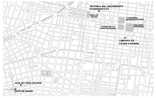 El lugar en cuestión en realidad no se llamaba Café de nadie, sino Café Europa y estaba ubicado al número 100 de la Avenida Jalisco, hoy Álvaro Obregón. Como se puede apreciar en la siguiente imagen, el sitio era céntrico, cerca de la plaza Rio de Janeiro y de la Avenida Niños Héroes en la colonia Roma Norte; se podía llegar fácilmente al café desde el Zócalo capitalino, cerca del cual se encontraban las oficinas del movimiento estridentista y la librería de Cesar Cicerón. Es posible que Maples Arce haya conocido la colonia Roma mientras frecuentaba al poeta Ramón López Velarde. La casa del autor de Suave patria estaba situada en la misma avenida del café, en el número 73. (García Barragán & Schneider, 2000) En sus memorias el veracruzano escribió al respeto: “no pocos domingos lo acompañé en sus paseos a la plaza Orizaba y a la iglesia cecina de la Sagrada Familia, a esperar la salida de misa de las muchachas”. (Maples Arce, Soberana juventud, 2010:40) Se puede hipotetizar entonces que el fundador del estridentismo ya conocía la zona cuando descubrió El Café de nadie, ya que probablemente había seguido frecuentándola después de la muerte de López Velarde, el 21 de junio de 1921. La colonia Roma, donde se ubicaba el café, era de reciente constitución, ya que había sido construida a partir de 1902 y era destinada a la burguesía medio-alta pre y post revolucionaria. Las avenidas eran de estilo europeo, similares a las parisinas, anchas y arboladas, pensadas para una metrópolis moderna (Santa María, 1993). No debe entonces sorprender el atractivo que un café ubicado en esta colonia representaba para los jóvenes vanguardistas.