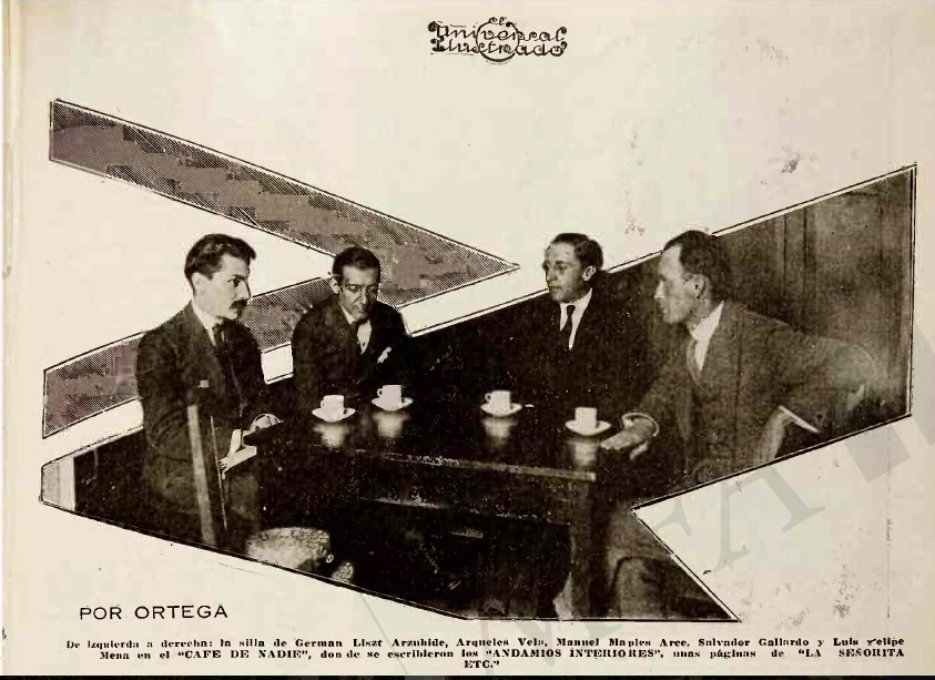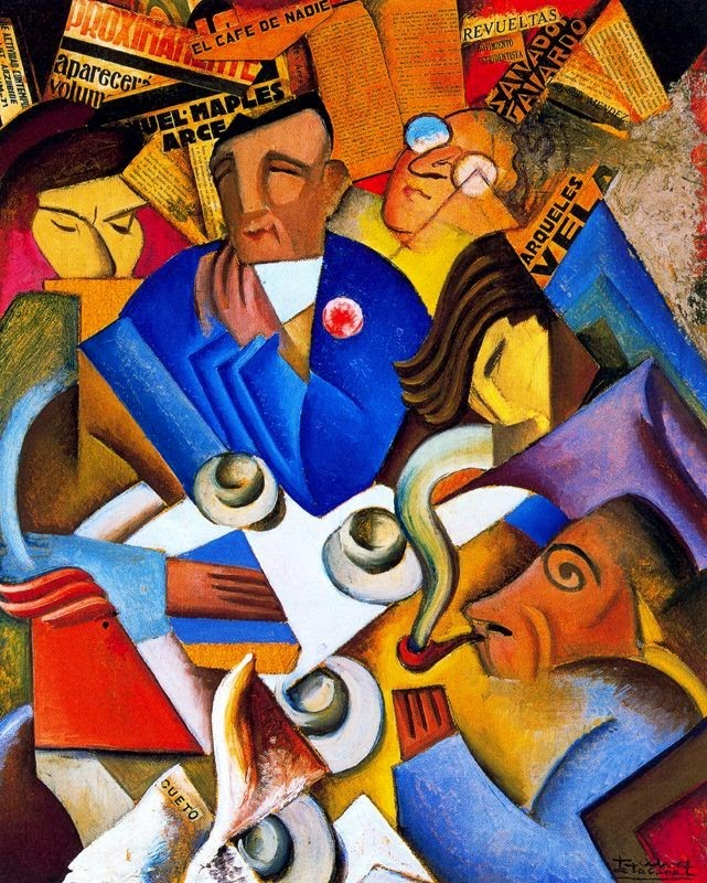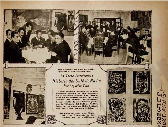 En rigor, los clientes asiduos del Café, además de Maples Arce, eran Arqueles Vela, Salvador Gallardo, Germán List Arzubide –cuando podía realizar sus escapadas de Puebla al D. F.– Luis Marín Loya, Febronio Ortega, Miguel Aguillón Guzmán, Gastón Dinner, Francisco Orozco Muñoz, los músicos Manuel M. Ponce y Silvestre Revueltas, y el grupo de pintores que colaboraban estrechamente con el movimiento: Diego Rivera, Leopoldo Méndez, Germán Cueto, Ramón Alva de la Canal, Jean Charlot y Fermín Revueltas. Es de suponerse que además de conversaciones y discusiones entre tazas de café, alcohol y cigarrillos, se realizaban los fundamentales proyectos para la conducción del movimiento: exposiciones, la gestación de una editorial y la creación de la segunda revista estridentista Irradiador (Schneider, 1997:80).