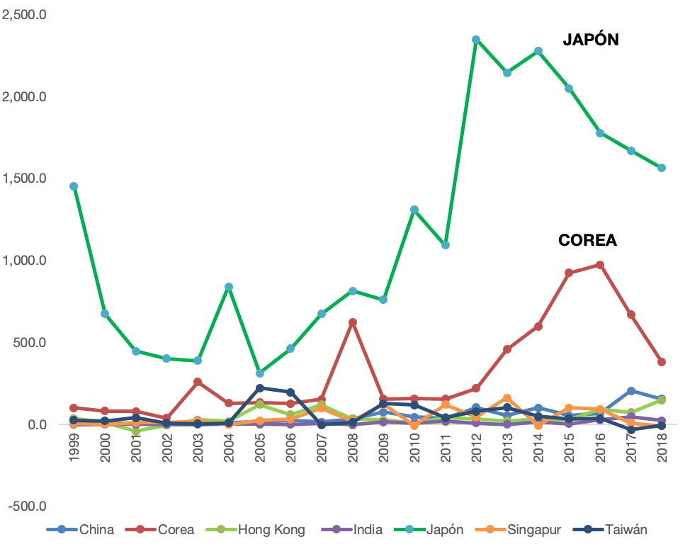 En materia de inversión, los japoneses han mantenido su fortaleza, pese al ligero declive de los últimos cuatro años. Entre 1999 y 2018 invirtieron 33,459.7 millones de dólares. A principios del siglo se había observado una baja considerable. En un segundo nivel, con 6,424.2 millones de dólares, está Corea del Sur, que también ha disminuido su inversión en México. En un tercer nivel está el caso interesante de Taiwán que le prestó más atención a México que su vecino el otro lado del estrecho taiwanés. Hasta 2018, tomando en cuenta lo invertido desde 1999, los taiwaneses habían invertido 1,090 millones frente a los 1,043 millones dólares provenientes de China. Sin embargo, la tendencia es que esta situación habrá de cambiar. En los dos últimos la inversión isleña ha sido negativa. En 2017 fue de -33 y en 2018 de -7.4 millones, frente a los 205.3 millones y 154.5 millones de los chinos en los mismos años. Con poco menos de 900 millones están en un tercer nivel Hong Kong y Singapur. Los indios aparecen en el último nivel con 178.4 millones de dólares.