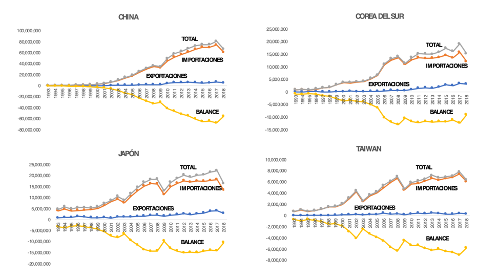 En materia de comercio bilateral, encontramos la materialización parcial de la inversión. También hay patrones consistentemente claros, al menos de acuerdo con los casos significativos escogidos en este trabajo: China, Corea del Sur, Japón y Taiwán. Todos ellos son importantes no solamente en cuanto a cantidades se refiere, lo son por los patrones que muestran.