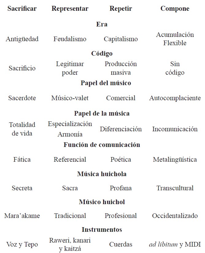 Estos tres tipos de música que co-existen en la actualidad y se reproducen en los diferentes contextos tienen un paralelo con las tres primeras etapas de la música delineadas por Attali (1985) de acuerdo con su función social: (1) Sacrificar; (2) representar, (3) repetir, y (4) componer. La incorporación de la música huichol en el esquema del Attali produciría los siguientes acoplamientos: