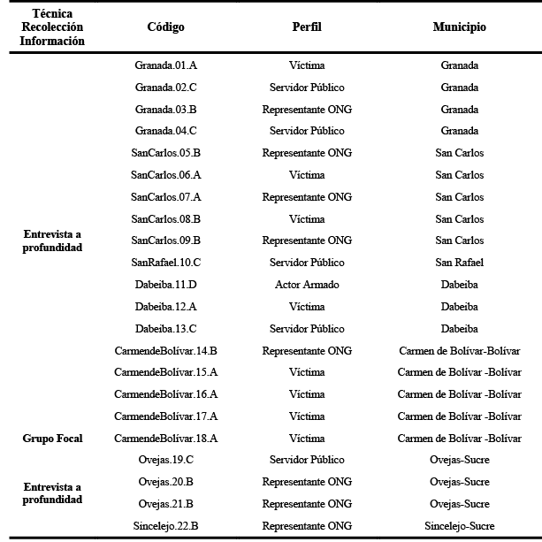 Se realizaron 21 entrevistas a profundidad en las regiones Noroccidente y Caribe. En esta última región se hizo además un grupo focal con 13 víctimas de un Colectivo de Mujeres. Para la muestra se eligieron diferentes perfiles de actores sociales que estuvieron implicados en el conflicto: mujer víctima de violencia sexual, servidor público vinculado a programas de atención a víctimas, representantes de ONG que trabajan con víctimas de violencia sexual, y actores armados.