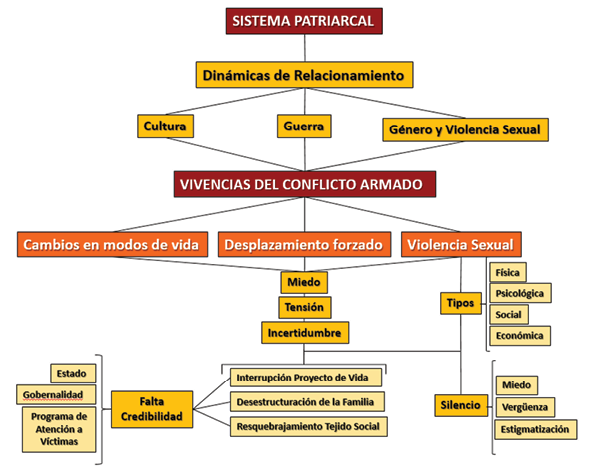 El ambiente de la comunidad era de confianza y solidaridad, había un capital social constituido por redes de apoyo entre todos los habitantes el cual se debilitó paulatinamente con la incursión de grupos armados al margen de la ley en sus territorios. Resultado de esta ocupación forzada algunos miembros de la comunidad se vieron involucrados con éstos grupos. Es así como las víctimas narran que fueron implicadas, directa o indirectamente, por sus parejas, lo que las obligó en algún momento de su vida a un desplazamiento forzado para salvaguardar su integridad y lograr salir de la situación. Las mujeres que no lograron emigrar de sus territorios se vieron sometidas a diferentes tipos de violencia, entre ellas la violencia sexual.