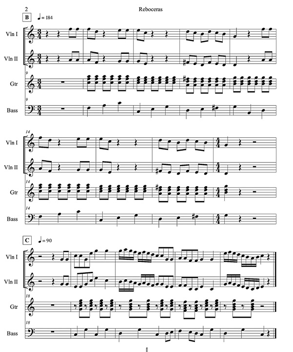 A continuación se presenta la partitura básica por secciones de la música correspondiente a la danza de “Las reboceras” generada con el software Finale. La codificación se realizó de manera manual y requirió hacer uso de conocimientos musicales. Las distintas secciones que componen la estructura de la melodía están denotadas por las letras A, B y C y consideran en su estructura dos violines, guitarra y bajo (guitarrón). Según la codificación generada en el software para su reproducción MIDI y notación, la sección A presenta un compás de 4/4, sección B y C de 3/4. La partitura generada especifica la duración de las notas negras generadas de acuerdo con cada pasaje, una característica que el software requiere para la correcta codificación. La grabación efectuada de la pieza musical lleva la siguiente estructura, basada en las repeticiones de las secciones identificadas: AAAA - B - CCCC – B.