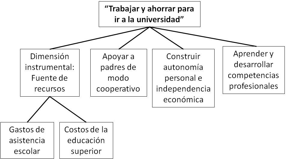 La intención de trabajar para obtener los recursos necesarios para asumir los costos de estudiar una carrera universitaria encierra un modelo cultural que organiza diversos significados atribuidos al trabajo en relación con las expectativas y aspiraciones de formación universitaria y de inserción laboral profesional, como conseguir recursos, ayudar a sus padres con los gastos, pagar los costos de los servicios educativos, asumir los gastos de asistir a la escuela; mientras otros jóvenes asumen que hacer estudios superiores es parte de un proyecto de carácter personal, individual, por lo que lo buscan –y pretenden– hacerlo viable de manera independiente a la familia. Otros estudiantes ven el trabajo como una instancia de aprendizaje que contribuya a la formación en la carrera que esperan estudiar.