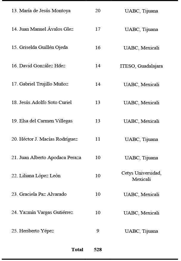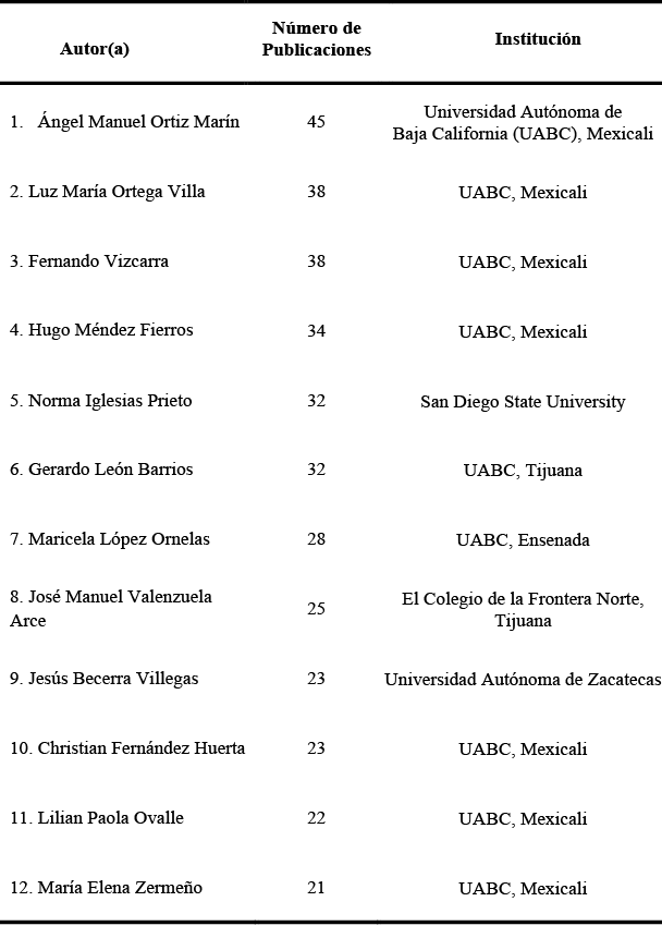 El Cuadro VII presenta a los veinticinco autores con mayor número de publicaciones y las universidades a las que pertenecen. Son académicos actualmente adscritos a dependencias de educación superior del estado, o que en alguna etapa de su trayectoria trabajaron en dichas instituciones y participaron significativamente en la construcción de nuestro campo académico, como los casos de Jesús Becerra Villegas en la UABC campus Mexicali, Norma Iglesias en EL COLEF, o David González Hernández en la UABC, campus Tijuana.