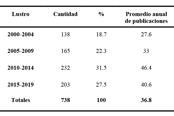 El presente inventario, por su parte, registra 738 documentos en total, publicados durante el período 2000-2019, con un promedio anual de 36 publicaciones (véase el Cuadro II), lo que representa un aumento del 126% con respecto a las dos últimas décadas del siglo pasado. Destaca el hecho de que en los últimos diez años se editaron 435 textos en y sobre Baja California, con un promedio anual de 43 publicaciones.
