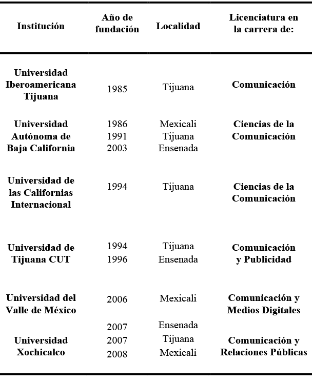 La investigación académica sobre esta materia en Baja California se origina y desenvuelve en torno a las escuelas de comunicación. La primera licenciatura en Ciencias de la Comunicación en la entidad se crea en la Universidad Iberoamericana campus Tijuana, en el segundo semestre de 1985. Por su parte, la Universidad Autónoma de Baja California funda esta licenciatura en 1986 en Mexicali, en Tijuana en 1991 y en Ensenada en 2003 (véase el Cuadro III). En este escenario, es importante reconocer que, a 43 años de la creación de su primera carrera de comunicación en Mexicali, la UABC permanece como miembro del Consejo Nacional para la Enseñanza y la Investigación de las Ciencias de la Comunicación CONEICC y de la Asociación Binacional de Escuelas de Comunicación BINACOM, organismos esenciales para el desarrollo de culturas universitarias más críticas y complejas. Cabe mencionar que, en 2009, Hugo Méndez Fierros y yo coordinamos el libro Huellas compartidas. Ensayos sobre el campo académico de la comunicación en Baja California, donde se ofrece una lectura más acabada sobre el devenir de nuestra disciplina en el estado.