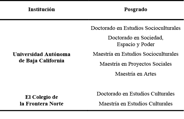 Uno de los factores determinantes en el crecimiento y maduración de este campo de conocimiento tiene que ver con la implementación de programas de posgrado en ciencias sociales y humanidades. Con la llegada del nuevo siglo, la UABC y El Colegio de la Frontera Norte han encabezado la oferta de maestrías y doctorados que albergan proyectos de tesis asociados a nuestra temática. En la esfera de la UABC, el doctorado y la maestría en Estudios Socioculturales desarrollan una línea de generación y aplicación del conocimiento denominada Discurso, poder y representaciones. El doctorado en Sociedad, Espacio y Poder cultiva, por su parte, un eje cognitivo en Poder, tiempo y significado. Y la maestría en Proyectos Sociales ejerce la línea de Intervención, comunicación y cambio social. El Colef impulsa en el doctorado y la maestría en Estudios Culturales, tres líneas de conocimiento que acogen proyectos comunicológicos: Identidad, frontera y migración; Historia, memoria y patrimonio cultural, y Género, sexualidad y poder (véase el Cuadro IV).