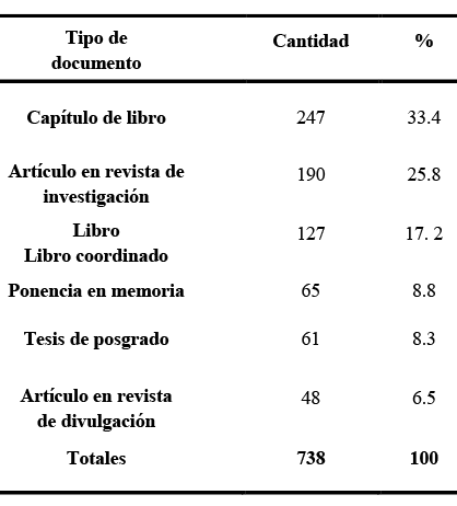 Este inventario está compuesto por referencias de publicaciones impresas y digitales de tipo académico y divulgativo, seleccionadas por su formato bajo la siguiente clasificación: libros de autor, libros coordinados y compilados, capítulos de libros, ponencias publicadas en memorias, artículos en revistas de investigación, artículos en revistas de divulgación, tesis de maestría y tesis de doctorado. El conjunto, se estructura y se analiza a partir de cuatro grandes apartados: