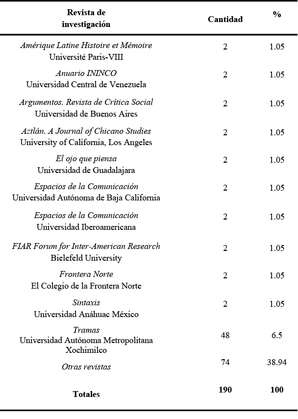 De las revistas de investigación incluidas en el Cuadro VI, Culturales y Estudios Fronterizos pertenecen a la UABC y Frontera Norte a El Colegio de la Frontera Norte. Las tres están adscritas al Índice de Revistas Mexicanas de Investigación Científica y Tecnológica del CONACYT y se encuentran, como la mayoría de las que integran el cuadro, en los principales índices, directorios, bases de datos y portales de revistas científicas de Hispanoamérica como Redalyc, Scielo, Biblat Latindex, Doaj, Dialnet y otros. Todas las revistas contenidas en este cuadro siguen vigentes, excepto Espacios de la Comunicación de la Universidad Iberoamericana Santa Fe y Texto Abierto de la Universidad Iberoamericana León. Al respecto, llama la atención la ausencia o escasez de materiales bajacalifornianos en importantes medios como Diálogos de la Comunicación de la Federación Latinoamericana de Facultades de Comunicación Social (FELAFACS), Revista Latinoamericana de Ciencias de la Comunicación de la Asociación Latinoamericana de Investigadores de la Comunicación (ALAIC), Versión de la Universidad Autónoma Metropolitana-Xochimilco, o la legendaria Chasqui. Revista Latinoamericana de Comunicación, editada por CIESPAL. Queda como conjetura la escasez de redes académicas entre las universidades de esta región y otros centros académicos nacionales e internacionales, que explica el grado de aislamiento en el que todavía trabajan los profesores e investigadores de nuestro campo.