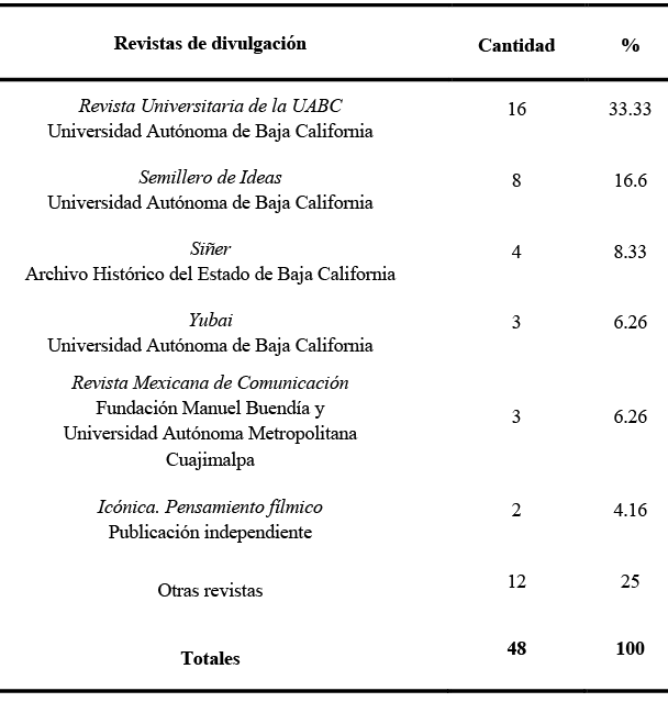 Con relación a los artículos publicados en revistas de divulgación, el Cuadro VII nos muestra un panorama distinto al cuadro anterior. Se registraron 48 títulos en este rubro, los cuales representan el 6.5% del total del acervo catalogado. Los textos se distribuyen en 18 órganos cuyas tramas, por definición, se abren y se simplifican con respecto a los tratamientos de las revistas de investigación. Destaca en este rubro la labor divulgativa de la Universidad Autónoma de Baja California, que durante décadas publicó Revista Universitaria de la UABC, Semillero de Ideas, Yubai, Paradigmas, Divulgare, Travesía y Calafia. De las anteriores, solamente Revista Universitaria de la UABC continúa editándose en versión electrónica. Durante las últimas dos décadas, uno de cada tres textos registrados en la categoría de revistas de divulgación fue publicado en este medio.