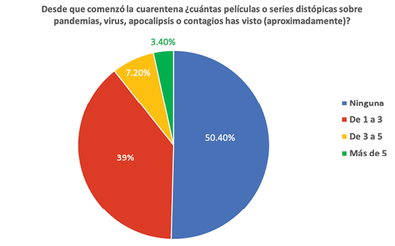 De los 127 encuestados que afirmaron haber visto contenido sobre el tema durante la cuarentena (teniendo la posibilidad de mencionar más de una película o serie), el 18,8% vio Flu; 14,1% de éstos vio World War Z; el 11,8% vio Contagion; 8,6% vio la serie original de Netflix Pandemics, y únicamente el 3.93% vio Outbreak. Fuera de las opciones que se dio a los encuestados, las películas que más dijeron haber visto dentro del género fueron Bird Box seguido de I am Legend y El Hoyo.