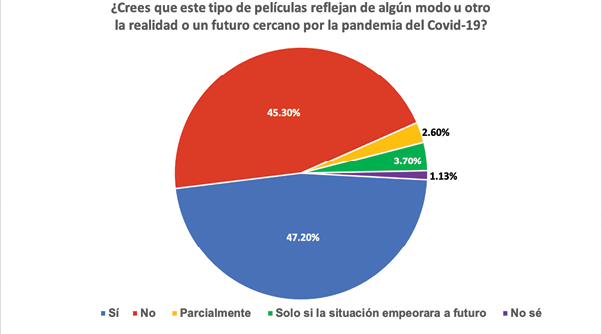 Todo lo anterior entra en juego si se habla del consumo de películas en la vida cotidiana, pero si se toma en cuenta que la pandemia y el confinamiento por el Covid-19 se presenta como un gran paréntesis en la cotidianidad, se agregan muchas otras variables de las que el consumo depende. En primer lugar, siendo determinante en el debate, qué tanto se apegaban a la realidad estas películas, la encuesta demostró que para muchos mexicanos es poco relacionable el desarrollo de estos acontecimientos a su entorno cercano. Por otro lado, si se recuerda que la mayoría de estas películas están filmadas en Estados Unidos, con aproximaciones más fuertes a la toma de decisiones que ha caracterizado a su gobierno por años, podría considerarse lógico que un ciudadano de este Estado se siente mayormente identificado con dicho escenario.