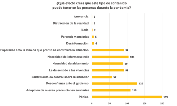 Finalmente, en la pregunta acerca de qué efecto pensaban que esta clase de contenido podía tener en los espectadores (nuevamente con posibilidad de seleccionar más de una opción), el 75% de los encuestados respondió que generaban pánico; el 41.7% cree que incita a la toma de medidas precautorias; el 48.5% opinó que causaba desconfianza ante las medidas del gobierno y la información que provee, y que crea una necesidad de informarse aún más; el 34.1% respondió que daba esperanza ante la idea de una pronta recuperación; el 33.7% piensa que le da sentido a lo que se está viviendo; 39.4% considera que genera una mayor necesidad de obtener información y el 34.5% cree que genera una mayor necesidad de aislamiento. La Gráfica III señala las respuestas correspondientes.