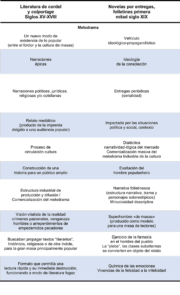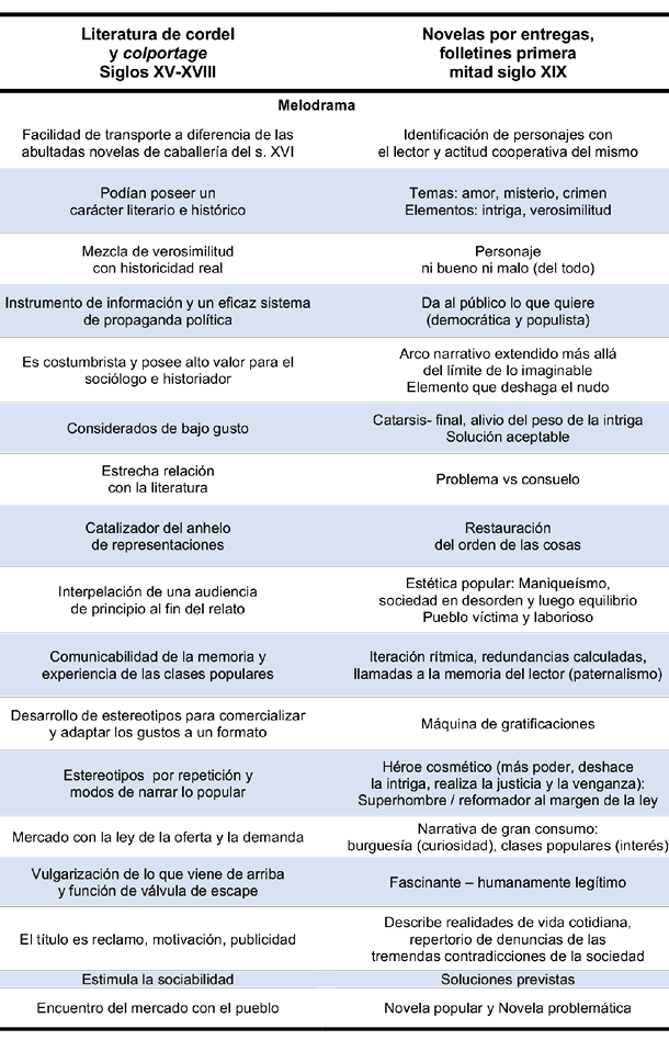 Como puede notarse en la Tabla I que se presenta en las siguientes páginas, no es exhaustiva y seguramente limitada al dejar fuera a algunos otros elementos. Sin embargo, deja ver la génesis de la configuración de las audiencias y su actividad a partir de la interacción del hombre del pueblo con el texto narrativo desde la literatura de colportage y de cordel. Se gesta ahí una fuerte relación comunicativa definida por la conectividad de la narrativa épica y cotidiana que marcará la pauta del papel que el público tendrá en el consumo del melodrama, un papel activo efectuado al reconocerse e imaginarse en la historia, un papel emancipatorio señalaría Rancière (en Alvarado, 2018). Y sobre todo es un “modo nuevo de existencia de lo popular” (Martín-Barbero, 1987:119) que media entre el folclor y lo masivo.