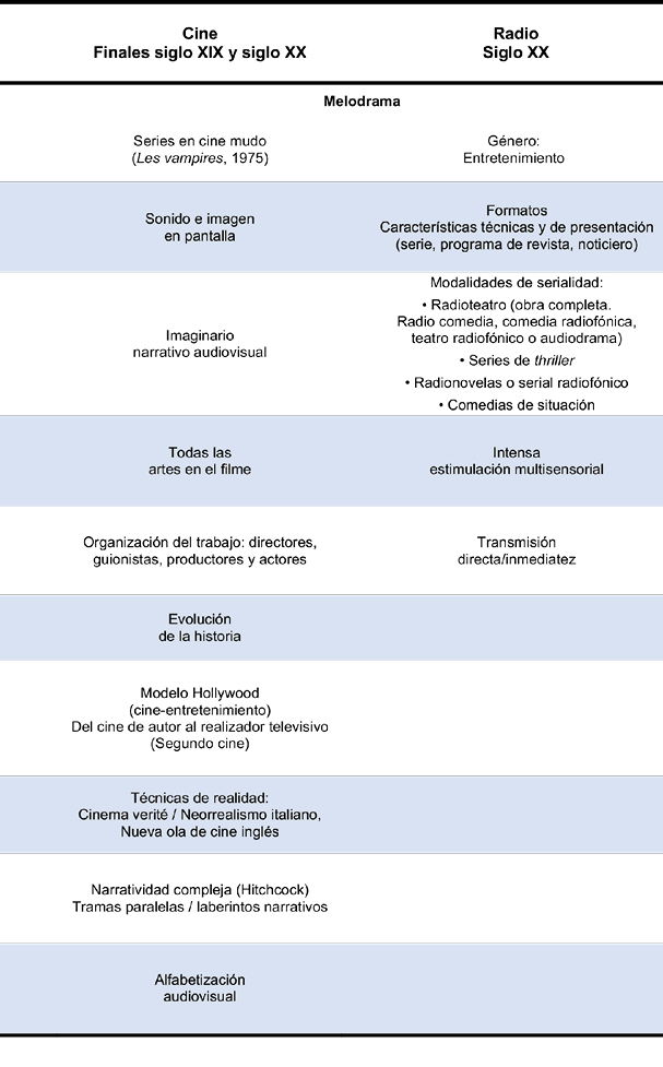 La radio por su parte, sin duda aportó el género mismo, el radioteatro y las radionovelas se definieron como géneros que a través de la serialidad e inmediatez estimularon la habitualidad y el rito de integrar el entretenimiento en familia en el centro del hogar que más tarde ocuparía la televisión como una tecnología doméstica.