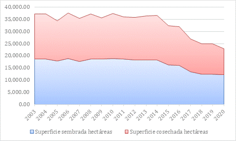 A continuación, puede revisarse la Gráfica 1 donde se muestra la inversión de plantío y cosecha de productos agrícolas en la comunidad de Zumpango, basada en los datos oficiales del Servicio de Información Agroalimentaria y Pesquera (SIAP); cabe mencionar que dicha página solo oferta datos desde el año 2003 hasta el 2021.