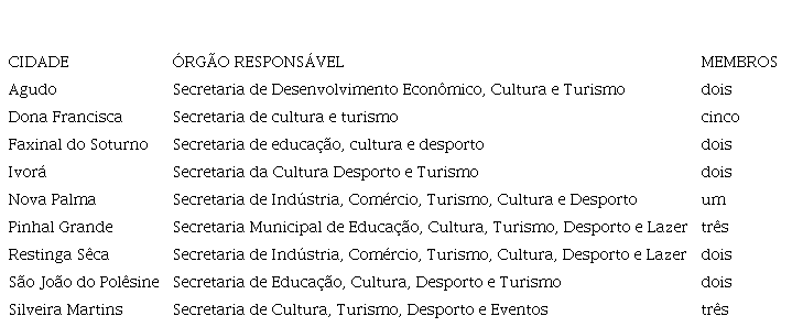 As cidades de Agudo, Dona Francisca, Ivorá, Nova Palma, Pinhal Grande, Restinga Sêca e São João do Polêsine não possuíam Plano Municipal. Quanto ao Fundo Municipal, somente possuíam as cidades de Agudo, Faxinal do Soturno, Ivorá, Restinga Sêca e Silveira Martins. Dado este panorama, percebe-se que Faxinal do Soturno era a única cidade que contemplava todos os requisitos apontados como essenciais para o sistema cultural. Ao contrário, São João do Polêsine não aderiu voluntariamente ao sistema e tampouco cumpria os requisitos para sua efetivação.