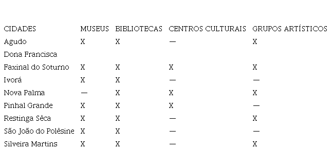 Com os dados informados pelos setores responsáveis pela cultura nos respectivos municípios da Quarta Colônia é possível descrever a realidade prática da gestão cultural a partir dos museus, bibliotecas, centros culturais e grupos artísticos. A seguir, apresentamos o Quadro II onde consta uma tabulação com relação aos equipamentos culturais e grupos artísticos: