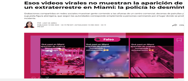 Con otras palabras, se diría que, el evento en Miami, como excusa expositiva para ilustrar el tópico que se aborda en este artículo, reúne una serie de características que demuestra la forma en que se construyen narrativas conspiracionistas. La ausencia de evidencia visual que documentara y expusiera lo acontecido para poder ver a los adolescentes en el hecho reportado oficialmente, no cumplió con las expectativas informativas de millones de usuarios de medios digitales; por lo que, al otro día, la auto confirmación de algunas comunidades de usuarios de redes sociales aficionadas a lo conspirativo (especialmente en TikTok) se desbordaron, primero preguntando, para después afirmar sobre un evento del que poco se sabía. En consecuencia —y en tanto comunidad discursiva—, corrieron la tesis respecto a que se estaba ocultando lo que realmente pasó; haciendo de la duda, pero sobre todo, del poco material en video disponible, la confirmación del hecho. Lo anterior, complementado por materiales y posicionamientos discursivos construidos por personas usuarias de esa red, quienes aseguraban haber estado en el centro comercial y llamaban la atención sobre entidades etéreas, traslúcidas, de rasgos alienígenas y enormes proporciones; testimonios que más que esclarecer, generaban confusión, al tampoco mostrarse evidencia sobre esto en los Medios de Comunicación Masiva (MCM) ni por quienes se decían testigos del evento; una ausencia informativa que confirmaba estarse ocultando el hecho de manera deliberada.