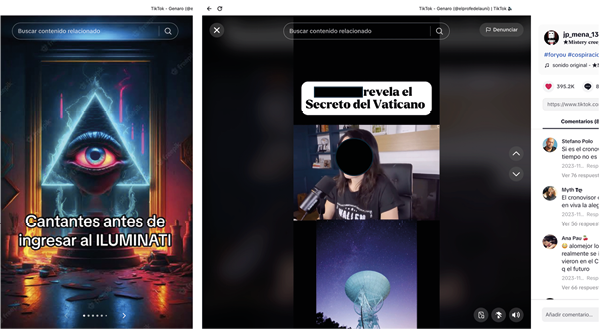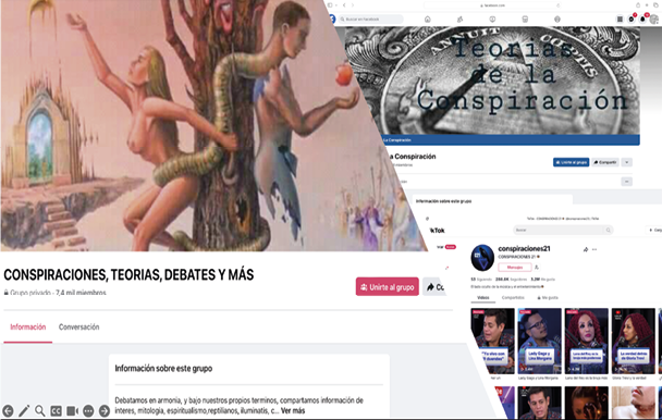 En el caso de cuentas y canales cuyo interés es generar contenidos ligados a creencias y teorías conspirativas que hemos analizado, tanto en Facebook, Instagram y TikTok, como en canales de YouTube, es posible encontrar administradores que abordan temáticas ligadas a estas narrativas, prevaleciendo un discurso que preferentemente señala o recae en personalidades y organismos de distinto perfil (empresarios, cantantes, realeza, sociedades secretas), cuya narrativa primordial es que «conforman la élite que domina al mundo», donde tienen cabida los iluminatis, los masones, los rosacruces, el club bilderberg, incluidos los reptilianos. En todos estos casos, las teorías sostienen que son personalidades o agrupaciones que emplean diversos medios para dominar al mundo, a través del control político, económico y las propias mentes de los seres humanos. La Figura 3 ilustra algunos de esos sitios, donde recursos iconográficos empleados dan identidad a la naturaleza del sitio. Iconos y símbolos, son elementos empleados para difundir estas creencias.