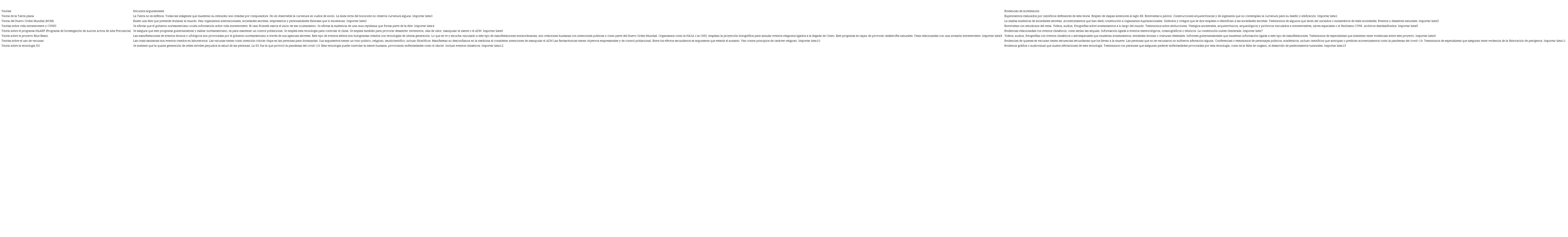 Pérez Caballero (2020) establece que una teoría conspirativa, es un razonamiento nomológico. Subraya que los teóricos de las conspiraciones sostienen argumentos y promesas “vacías de causalidad” (2020, p. 12), para lo cual explotan “sesgos cognitivos y rumores en una carcasa argumentativa” (p. 12) que, muchas veces se invisten “con trazos científicos” (p. 12), con la intención de mostrar hechos o sujetos que convenzan a los creyentes de tales relatos, procurando —en sus argumentos— manejar algunas evidencias que permitan correlacionar tesis de causalidad con cierta dosis de iluminación o predestinación del teórico conspiracionista o de aquel o quienes creen en este tipo de narrativas (Pérez Caballero, 2020).