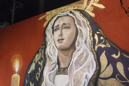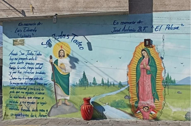 En concordancia con la heterogeneidad de estos sitios, la producción pictórica de información religiosa se presenta de dos formas: una relacionada a aspectos sociales, donde se destacan las representaciones de la Virgen de Guadalupe, San Judas Tadeo y la Santa Muerte como signos de cuidado y protección; y otra vinculada a aspectos meramente culturales y tradicionales, que suele darse principalmente en periferias históricas como barrios antiguos. En la zona barrial Tlaxcala-Santiago de la capital potosina, uno de los ejemplos de esta última es la Virgen Dolorosa.