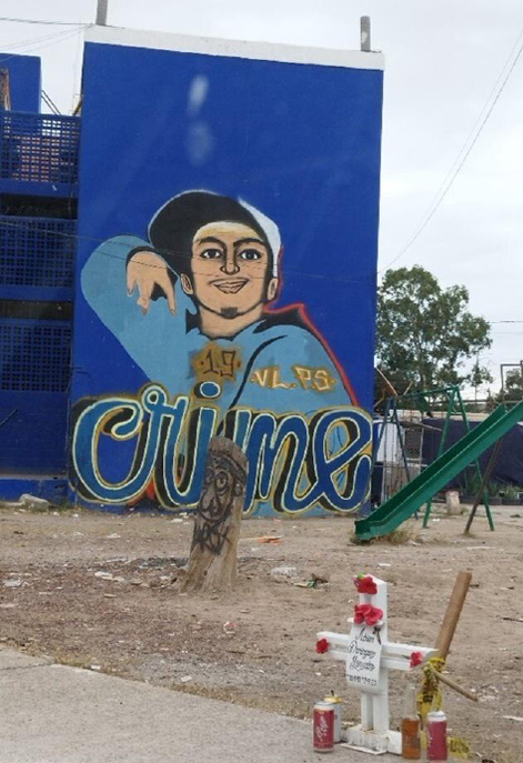 Así, la figura de la virgen, aparte del culto, es usada para ahuyentar borrachos o drogadictos, como búsqueda de seguridad y de paz, o como motivante de superación ante las adversidades sociales y económicas (Madrigal, 2009; Rivera, 2019), lo que, en términos semióticos, indica que se da una adaptación al contexto a modo relacional entre la información cultural simbólico-religiosa y la información social de abandono-descuido. La imagen de San Judas Tadeo suma lo barrial con información de protección pero también de ilegalidad (Marcial y Vizcarra, 2017; Rivera, 2019), haciendo que, dependiendo de sus ubicaciones, este tipo de contenido funja señal informativa de advertencia con funciones similares a las B3-Marcas pandilleriles. De manera similar, la Santa Muerte, figura que se sitúa en el margen de aceptación de la información cultural religiosa (Hernández, 2017), empata con información social proveniente de grupos que están al margen social como las pandillas, en este caso, dando lugar a que, en lo barrial, se sumen códigos que reflejan información social proveniente de prácticas pandilleriles vinculadas a la criminalidad, la inseguridad y la violencia (Cerbino, 2006; Perea, 2008).