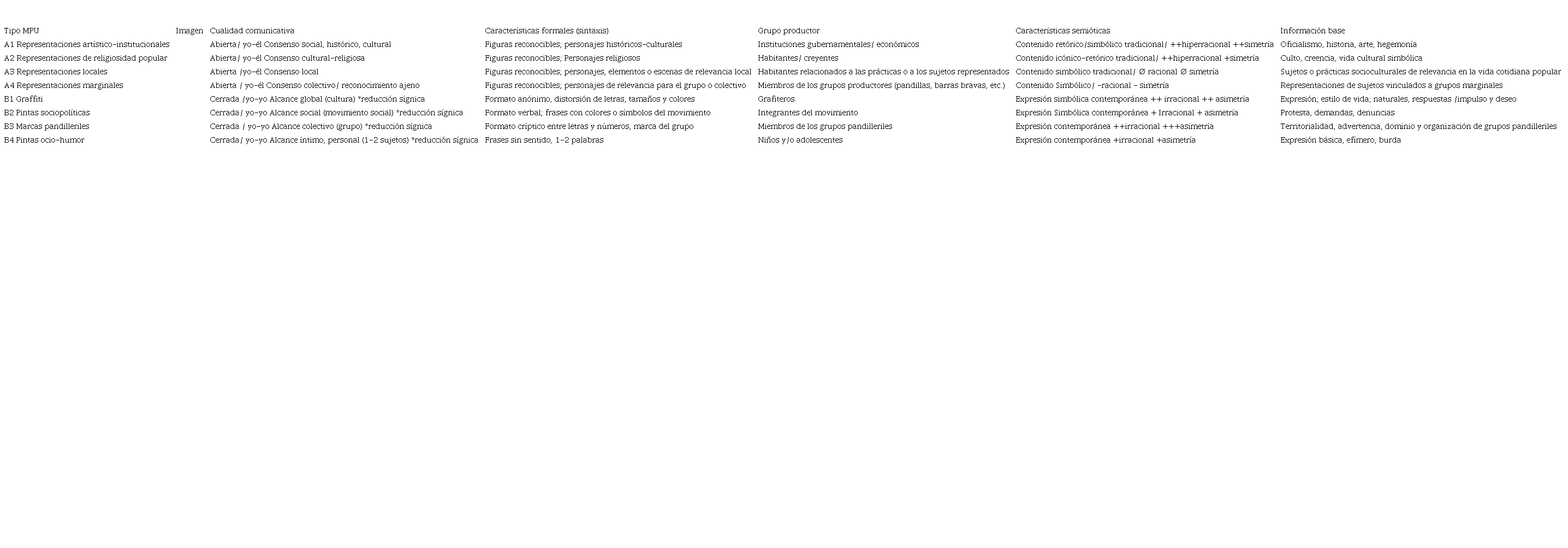 Así, es posible pensar en MPU como graffitis o pintas cuando la sintaxis es menos reconocible infiriendo que su memoria es altamente expresiva y sus cualidades comunicativas igualmente herméticas, o bien, pensar en las representaciones de mayor comprensibilidad y su figuralidad más identificable que buscan llegar a todo tipo de gente como murales con contenidos históricos o artísticos.