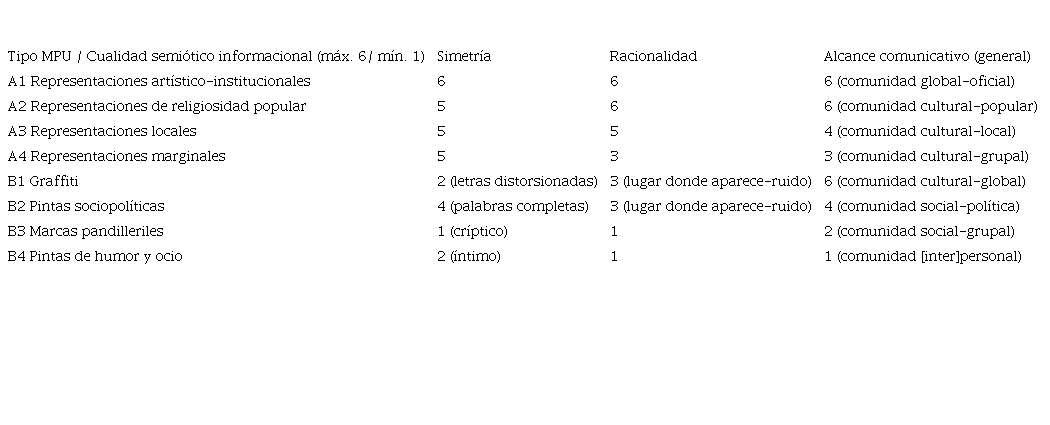 En la Tabla 1 se muestran los valores semióticos de información en cada tipo de MPU. Estos valores se trabajaron tomando en cuenta el nivel de información formal-sintáctico y el nivel de información de memoria-semántico desde el hecho de que la información más comprensible es aquella que se expresa en formas fácilmente reconocibles. A este aspecto se sumó el tamaño de la comunidad que produce los contenidos informativos ya que la cantidad o intensidad de trasmisión de la información entre sus miembros define el alcance comunicativo.