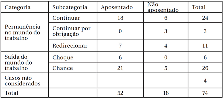A primeira divisão é entre pessoas que permaneciam no mundo do trabalho (38) e aquelas que saíram do mundo do trabalho (32) ou tinham esta pretensão. Dentro de cada um dos dois grupos, havia grandes divergências, principalmente em relação à motivação para permanecer ou sair. No grupo dos que continuaram no mercado de trabalho, foi feita a distinção entre as pessoas que queriam permanecer no mundo do trabalho por vontade própria e aquelas que indicavam a continuidade por obrigação e não por vontade própria. Um terceiro subgrupo foi estabelecido, pois, diferentemente das duas classificações anteriores, havia uma parte das pessoas que pretendia continuar, mas redirecionar suas atividades profissionais.