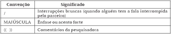 O elemento de descrição de dados foi a interação verbal entre as participantes. Buscou-se no campo da análise da conversação o conceito de turno de fala que foi utilizado na sistematização das interações. Para Marcuschi "[...] turno pode ser entendido como aquilo que um falante faz ou diz enquanto tem a palavra, incluindo aí a possibilidade de silêncio"(Marcuschi, 2003, p. 18). As interações verbais selecionadas para compor o corpus do artigo estão organizadas por conjuntos de falas. As transcrições foram cuidadosamente feitas e obedeceram a uma convenção baseada em Marcuschi (2003) conforme o quadro que segue.