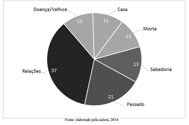 Das 104 obras localizadas, 49 focam o contato com o avô, 47 com a avó, e oito com ambos. Alguns livros eram bastante recentes, enquanto outros já eram conhecidos das estantes de literatura infantil, tendo sido lançados ainda na década de 1970. As temáticas abordadas variam de brincadeiras e relações cotidianas entre avós e netos, passando pela sabedoria e histórias do passado contadas pelos mais velhos, assim como situações de doença, velhice e morte dos avós. No gráfico abaixo, é possível observar, quantitativamente, as temáticas mais recorrentes2: