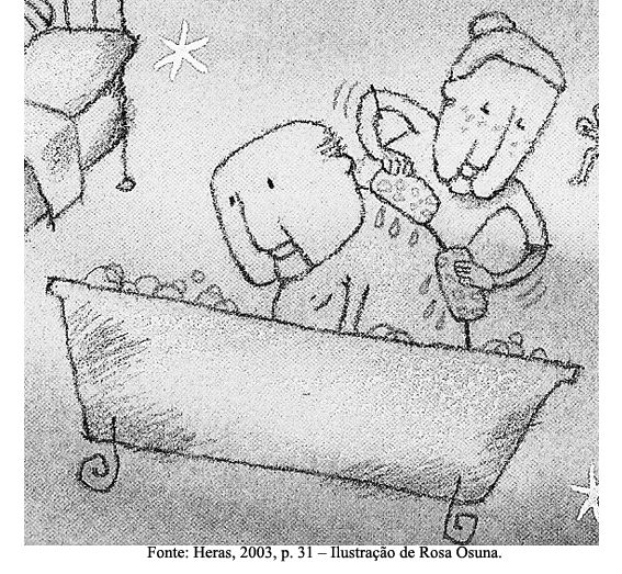 Além disso, as atividades que rodeiam o mundo feminino tendem a ser mais vinculadas à maternagem e ao cuidado, como se estas fossem características naturais das mulheres. Elas fazem tricô, costuram, contam histórias para os netos antes que eles durmam, cuidam de suas atividades escolares, dos ferimentos e da hora do banho. As imagens (re)produzem, assim, não apenas um ideal de avó, mas um ideal de mulher, que é atenciosa, compreensiva, amável e acolhedora.