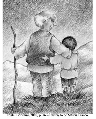 Alguns dias depois, o rei daquele lugar decretou que todos os idosos, por serem improdutivos, deveriam desaparecer de seu reino dentro de uma semana. Quem desobedecesse à ordem seria morto. Foi assim que os velhinhos começaram a desaparecer. Os que tinham recursos mudaram-se para outro lugar, longe do poder do malvado rei; outros morreram de tristeza ou abandonados; outros ainda foram mortos pelo decreto impiedoso do rei. Não ficou sequer um velhinho naquela região (Bortolini, 2008, p. 7 [O menino, seu avô e a árvore da vida]).