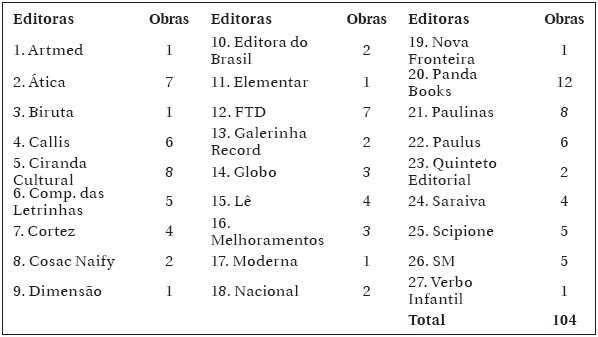 Neste rol não entraram, portanto, obras que falam da velhice em geral, ou seja, que trazem em suas narrativas personagens idosos, mas que não são necessariamente avós, tais como A velhinha maluquete (1998), de Ana Maria Machado, Cota, Maricota e Cotinha: as três velhinhas (2006), de Silvana de Menezes, ou Araújo e Ophélia (2006), de Ricardo Azevedo, por não ser este o foco da pesquisa. Também acabei deixando de lado livros que não possuem no título as palavras delimitadas, tais como Menina Nina (2005) e O menino e seu amigo (2005), de Ziraldo, embora abordem a relação das crianças com seus avós. Fiz essa opção para melhor delimitar minha busca, uma vez que, nesses casos, os títulos não seriam indicativos precisos do conteúdo temático das obras. Na tabela abaixo, apresento as editoras mapeadas e a quantidade de obras encontradas em cada uma: