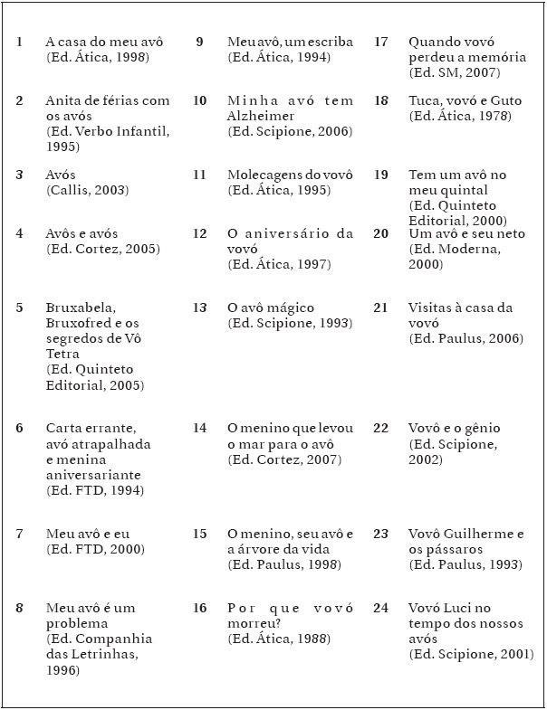 Buscando obras que abordam a relação entre avós e netos na literatura infantil, realizei um levantamento nos catálogos on-line de algumas das principais editoras do Brasil1. Tal mapeamento não busca, de forma alguma, apresentar a totalidade de obras existentes, mas acredito que possa nos ajudar a visualizar o que vem sendo produzido nos últimos anos sobre essa temática. Observei os catálogos de 27 editoras, tendo encontrado 104 obras cujos títulos trazem as palavras vô, vó, avô, avó, vovô ou vovó, critério que utilizei para melhor delimitar meu campo de análise.