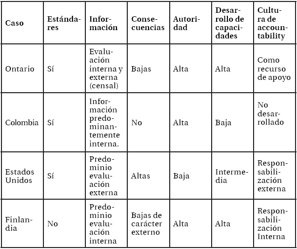 Finalmente, en cuanto a la instalación de una cultura de accountability, vuelven a existir importantes diferencias entre las definiciones de los casos analizados. Al respecto, nuevamente vuelve a configurarse el polo asociados al accountability performativo (Estados Unidos, Chile e Inglaterra), que promueven una cultura exteriorizada, orientada hacia la elección de escuelas en base a sus resultados. Este grupo contrasta con el finés, donde la cultura de la responsabilización es alta, pero está internalizada en los actores educativos. Por su parte, los casos de análisis de Ontario y Singapur, cuentan con definiciones intermedias, porque tanto la evaluación como sus efectos se nutren con insumos externos e internos a la escuela, lo que vincula a estos modelos más con el accountability de tipo profesional. Finalmente, en el caso colombiano están menos presentes los discursos referidos al accountability (exteriorizado o internalizado), en la cultura de mejoramiento del sistema educativo.