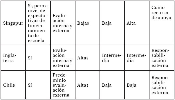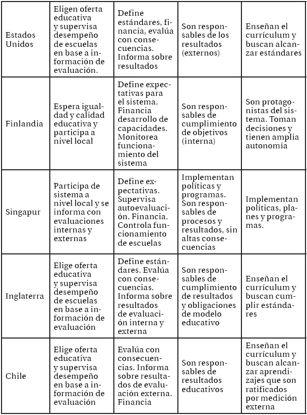 En relación con la información que genera el sistema, tanto para la rendición de cuentas, como para la responsabilización de los actores educativos, sí se observan perfiles más claros y diferenciados entre los casos. Mientras Colombia y Finlandia relevan el valor de la evaluación interna, en el otro extremo hay países que sostienen su accountability desde la evaluación externa. Esto ocurre con los casos estadounidense y chileno. Finalmente, al medio de estos dos grupos se ubican Singapur, Inglaterra y Ontario, que combinan ambos recursos de información en la generación de la evaluación que realizan sobre las escuelas. Estos tres casos utilizan información levantada centralmente e incluyen de manera institucionalizada la información provista por el nivel local en el proceso de accountability.
