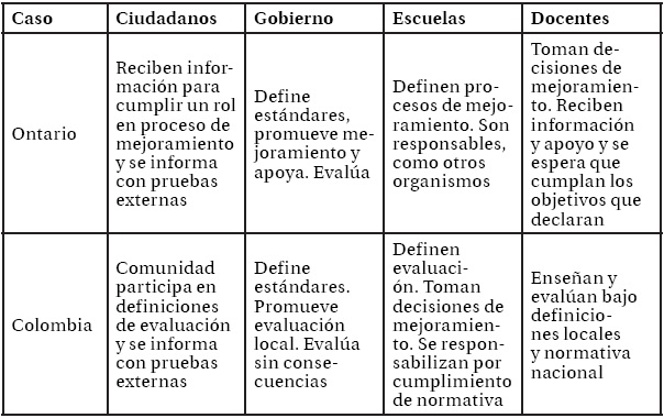 Los casos vuelven a diferenciarse respecto del rol definido para las escuelas, puesto que los países del polo performativo esperan un funcionamiento menos autónomo de las escuelas, para que puedan ajustar su funcionamiento y cumplir con los objetivos nacionales o estatales. Pese a ello, allí las escuelas son consideradas como las principales responsables de éxito o fracaso educativo. A este grupo se suma el caso de Singapur, debido al rol mayormente ejecutor de las políticas educativas estatales. Sin embargo, este país se diferencia del polo performativo en las características y contenido de la evaluación y respecto de la responsabilidad de las escuelas. Por su parte, Ontario nuevamente muestra una organización mixta, puesto que ponen énfasis en la responsabilidad de las escuelas, pero se asume un mayor protagonismo de ellas en la definición de expectativas y prioridades educativas. Esta última condición es también compartida por los casos colombiano y finés. Este último país mantiene una gran relevancia de la responsabilidad de las escuelas, pero esta tiene una determinación más interna que externa.