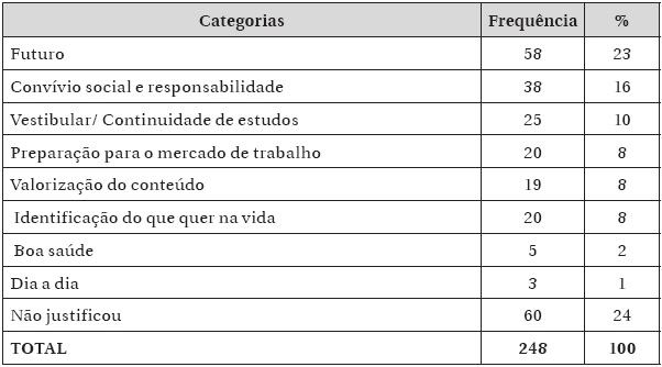 Em seguida, pedimos aos estudantes o relato de uma situação escolar que tivesse contribuído para seus projetos de vida e perguntamos por que ela foi importante. Os relatos deram origem a nove categorias de análise apresentadas na tabela 2.