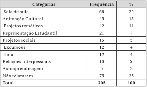 Se, por um lado, a valorização das disciplinas curriculares e das atividades em sala de aula permite-nos afirmar que, a despeito de todas as críticas feitas à falta de relação entre o que é ensinado na escola e a vida cotidiana, os estudantes conseguem encontrar sentido naquilo que vivenciam; por outro lado, não podemos deixar de reconhecer que as atividades que favorecem o protagonismo dos estudantes (participação em projetos e atividades de animação cultural) são importantes para uma educação que almeja a autonomia, o desenvolvimento da responsabilidade e o comprometimento frente a assuntos que envolvem interesses coletivos. Experiências dessa natureza ainda ocupam um lugar secundário na formação dos estudantes.