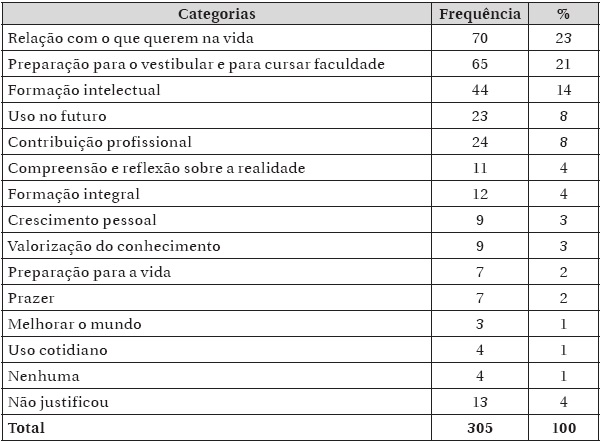 A categoria relacionada ao uso futuro do conhecimento também reuniu 8% dos participantes. Com 4% do total geral de respostas, encontram-se a categoria, compreensão e reflexão sobre a realidade, que se define pela possibilidade de compreender a realidade e refletir sobre o mundo, contribuindo, dessa maneira, para as relações sociais. A categoria formação integral, que se refere ao desenvolvimento intelectual, moral e físico, foi valorada por 4% dos estudantes.