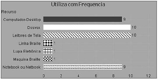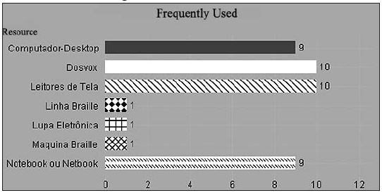 Quanto aos recursos de TA utilizados com maior frequência, os dados demonstraram que, a partir do momento em que os usuários com DV passam a utilizar o computador equipado com Dosvox e leitores de tela, eles deixam de utilizar os recursos associados ao sistema Braille. Tal dado reafirma a importância da tecnologia como ferramenta de acesso à informação e comunicação das pessoas com deficiência visual.