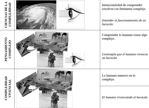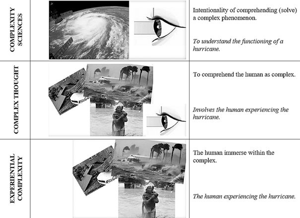 Usando como metáfora el fenómeno de ocurrencia de un huracán, podemos decir que las ciencias de la complejidad se orientan a conocer el funcionamiento o comportamiento del huracán, y que el pensamiento complejo se orienta a reconocer al humano inmerso en el huracán (y al mismo humano como un huracán más). Los desarrollos en las ciencias de la complejidad responden principalmente a lo cuantitativo; numerizan, grafican, modelan, atienden a un producto, a una meta. El pensamiento complejo responde a lo cualitativo, atiende al humano en sí mismo como un fenómeno complejo y que vivencia. Este último aspecto es fundamental, pues al estar el humano inmerso en un fenómeno complejo y tener la facultad de vivenciar, emerge otro fenómeno complejo o tipo de complejidad: una complejidad vivencial, entendida como aquella que se constituye entrelazada a la experiencia del humano vivenciando lo humano, en la complejidad en que se encuentre inmerso. La complejidad vivencial es aquella complejidad que “[...] se da justamente en el acto de vivenciar” (Ávila, 2018, p. 239).