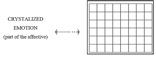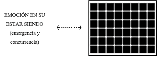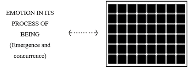 La Figura 2, ilustra a las emociones como un proceso dinámico y activo, en su estar siendo, en su estar configurándose. Al mirar detenidamente al interior del recuadro en esa figura, se puede observar que los puntos blancos a los que no se mira directamente parecen cambiar de color, se vuelven de color negro y hasta parecen brillar. La Figura 3, ilustra lo que sucede al atender a la emoción como algo ya cristalizado, que ocurre o ha ocurrido en un ámbito propio de lo afectivo sin ahondar en su estar siendo. Con base en la analogía de acción y dinamismo de la Figura 2, nos proponemos caracterizar a las emociones en términos de emergencia/concurrencia.